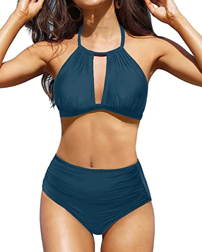 Embrace retro style with these women’s two piece high waisted bikini swimsuits, featuring adjustable halter straps, clasp hook closure, removable padded bra, and full coverage ruched bottoms for tummy control.