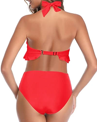 Look and feel your best in this two piece high waisted bikini set featuring a padded hard cup bikini top with adjustable halter neck and back tie, ruffle flounce longline design for a cute vintage look, and a tummy control high waisted bikini bottom with ruched detail for moderate coverage, all made with smooth and elastic fabric for comfort and durability, perfect for any beach or pool occasion.
