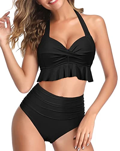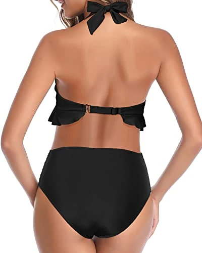 Get beach-ready with this High Waisted Push Up Ruffle Tummy Control Bikini Set for women, featuring an adjustable halter neck and backless design.