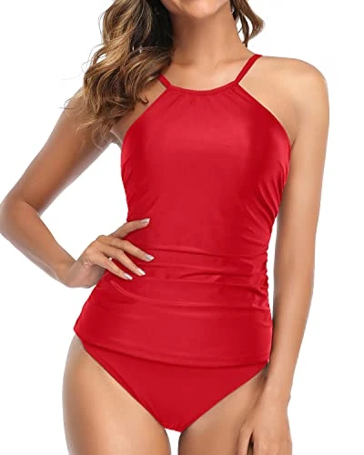 Elevate your beach look with this high neck ruched tummy control tankini, designed to enhance your curves and provide a comfortable, breathable fit for a day at the beach.