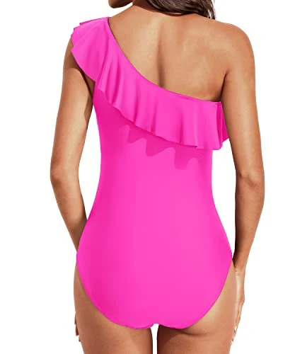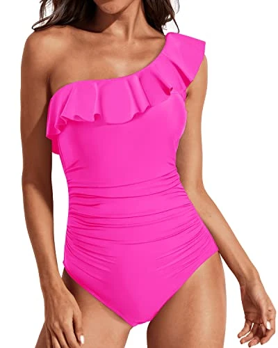 Asymmetrical Neckline Ruffle One Shoulder Swimwear-Neon Pink