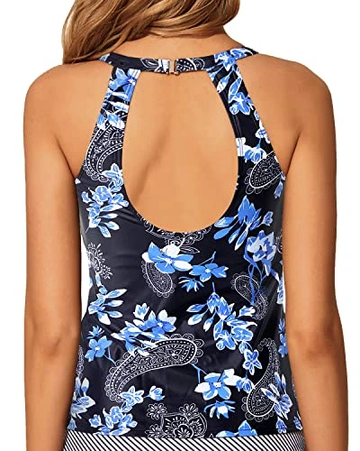 Stay stylish and comfortable in this high neck tankini top with a red floral design, featuring a neck hook closure and removable padded push up bra for support and shape, and a backless design to accentuate your curves and make you feel elegant and sexy.
