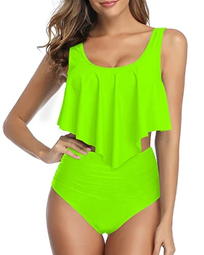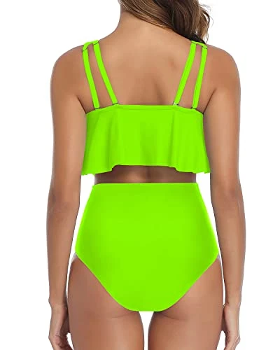 Enjoy your vacation, beach party or pool swimming in this must-have two piece bikini, designed with a ruffled flounce top with adjustable double straps, removable padded push up bras, and high waist ruched bottom for tummy control and a flattering fit, all made with high quality stretchy and comfy fabric.
