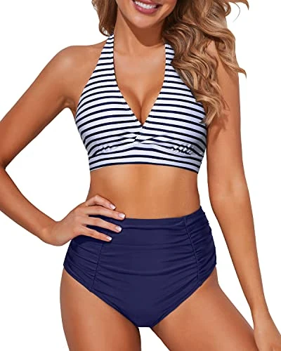 The Women Two Piece High Waisted Bikini Set Swimsuits are the perfect choice for your next beach vacation or pool party, with a push-up retro V-neck design and ruched high-waisted bottoms for tummy control.