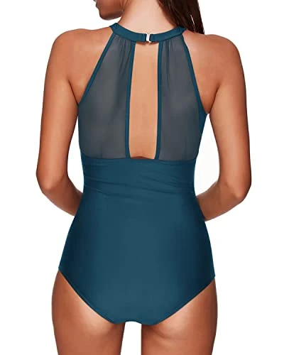Discover the perfect combination of comfort and style in this smooth and stretchy high neck plunge mesh ruched one piece swimsuit.