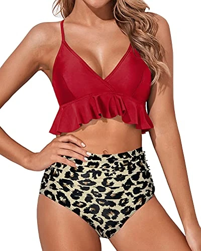 Get ready to turn heads in this ultra feminine and flattering high waisted ruffle flounce tummy control bikini set with trendy printed patterns.