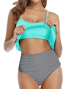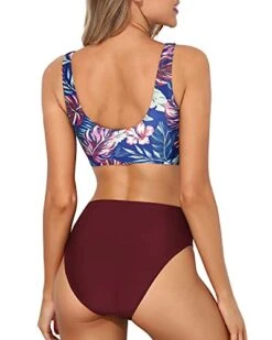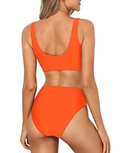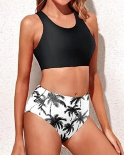 Elevate your swim game with this chic and sporty two piece bikini set for women, featuring a high waisted bottom with elastic band and a high neck top with adjustable cutout back and removable padded bra.