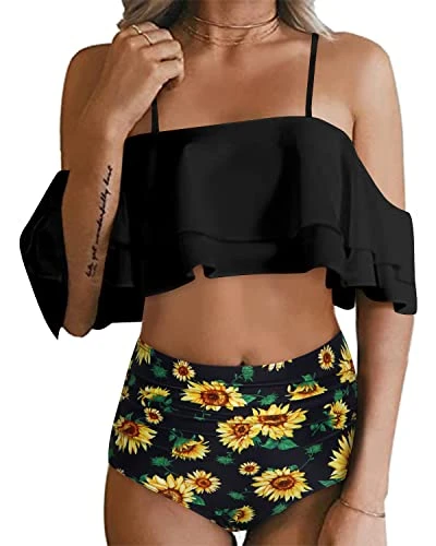 Stand out in style with our Two Piece High Waisted Tummy Control Ruffle Off Shoulder Bikini Set, designed to flatter your figure and make you feel confident and beautiful.