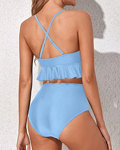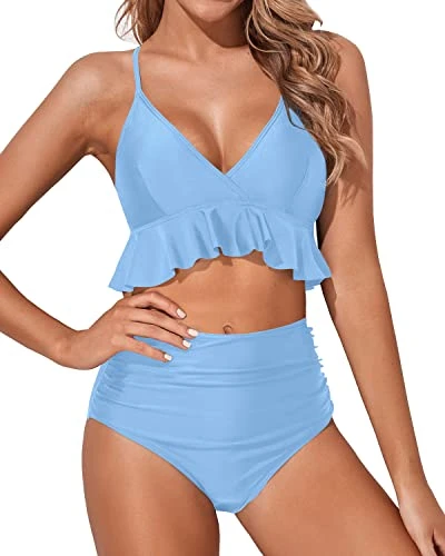 Make a statement at the beach or pool in this trendy and comfortable high waisted ruched bottom bikini set with a ruffle flounce top and printed patterns.