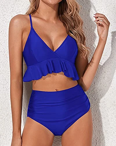 Make a splash in this gorgeous and comfortable high waisted ruffle flounce tummy control bikini set, featuring adjustable straps and padded push up bras for extra support.