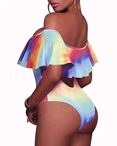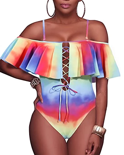 Stand out from the crowd in this elegant lace-up color tie dye monokini with a trendy ruffled flounce design and flattering push-up bra.