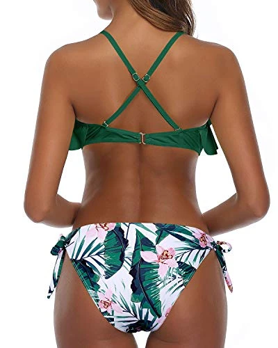 Show off your curves in this eye-catching two piece flounce ruffled cross back bikini set that comes with a double ruffled flounce top and a cheeky, tie-side bottom with a cute triangle detail.