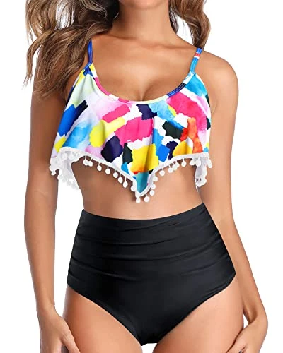 Make a statement in this women’s two-piece bikini featuring a flowy top with pom pom trim and ruffled flounce, adjustable straps, and a high-waisted bottom with tummy control, all made from stretchy, durable, and breathable fabric, perfect for any water activity.