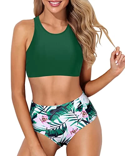 This green tropical floral two piece swimsuit set for teens girls is designed to flatter most curves with its sporty high neck tank top and comfortable, breathable fabric.