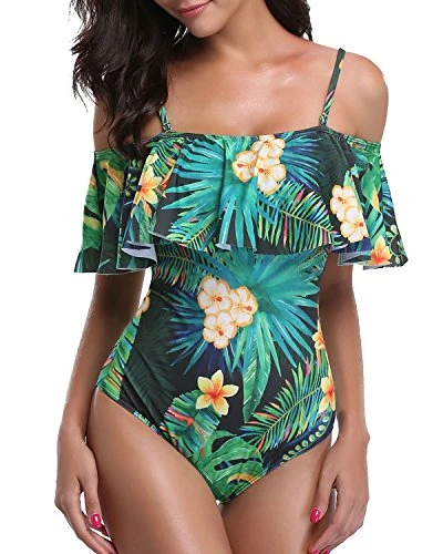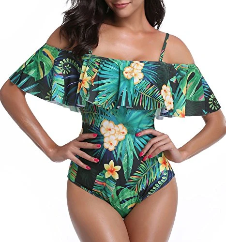 Make a statement with this vintage-inspired off shoulder swimsuit, featuring a unique ruffle detail and comfortable elastic fabric.