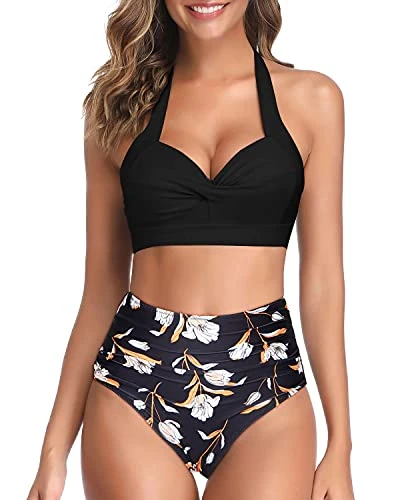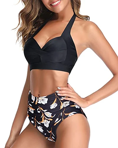 This two-piece retro vintage ruched high waist bikini set has adjustable self-tie halter neck with clasp hook closure, padded push-up bra and pleated front panel for tummy control. Made of high-quality, stretchy and comfortable material. Perfect for a beach vacation or honeymoon.