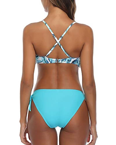 This two piece flounce ruffled cross back bikini set is the perfect combination of style and function, with its padded top, adjustable straps, and high-cut, tie-side bottom.