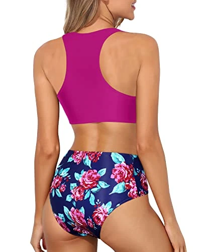 Get ready to make a splash in this high waisted sporty racerback bikini set, featuring a tank style top and full coverage bottom with tummy control effect for a perfect fit.