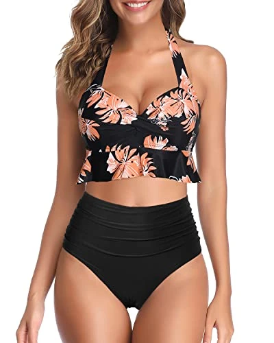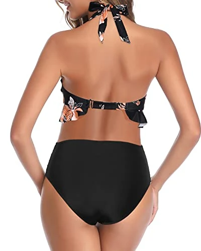 This 2-piece bikini with adjustable halter neck, padded cup top, and ruffle flounce longline design. High-waisted ruched bottom with tummy control. Vintage style for girls, teens, and ladies.