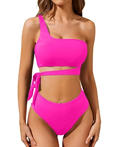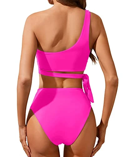 Feel confident and comfortable in this Women Two Piece High Waisted Bikini Set One Shoulder Swimsuits Tie High Cut Bathing Suits with Bottoms, designed with a double-layer fabric, a removable padded push-up bra for support and shaping, and a tummy control high-waisted bottom to hide any imperfections.