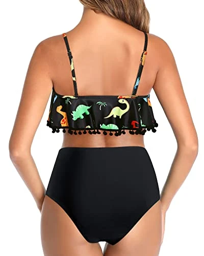 High Waisted Two Piece Bikini Swimsuit Ruffle Flounce Trim-Black Dinosaur