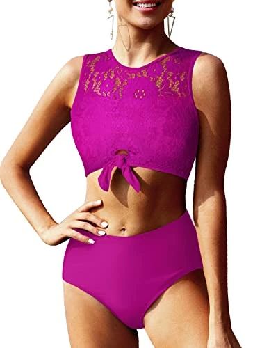 Upgrade your beach style with this stunning two piece swimsuit set featuring a see-through lace top and full coverage high waisted bottoms.