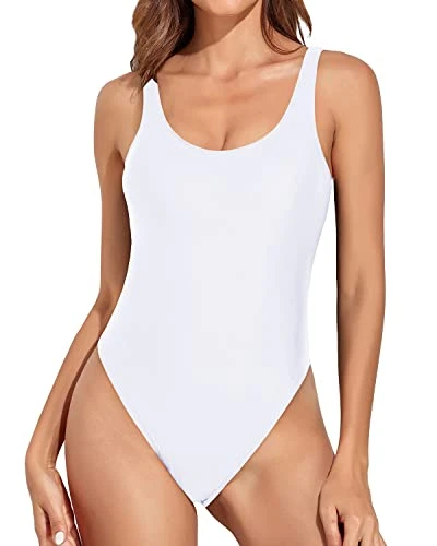 Low Back Scoop Neck Retro 80S High Leg One Piece Swimsuit-White