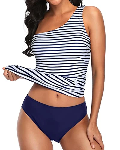 Modest Tummy Control Ruched Detail For Women Tankini Two Piece-Blue White Stripe