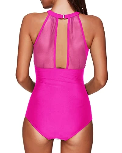 One Piece Mesh Ruched Monokini Swimsuit High Neck For Women-Neon Pink