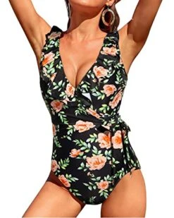 Tummy Control Tie Side Wrap Slimming Ruffle V Neck One Piece Swimsuits-Black Pink Flowers