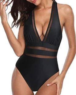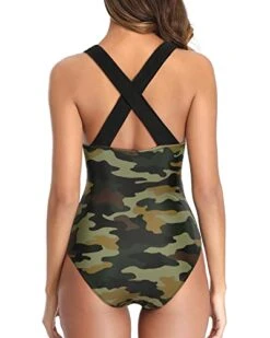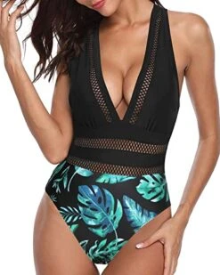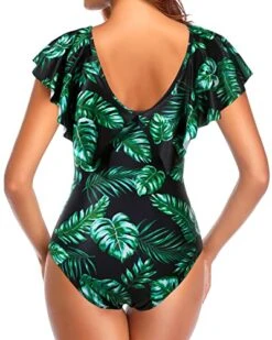 Women V Neck Flounce Sleeve Tummy Control Ruffle Shoulders One Piece Swimsuit-Black Green Leaves