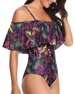 Feminine One Piece Swimsuit Off Shoulder Ruffles-Purple Leaf