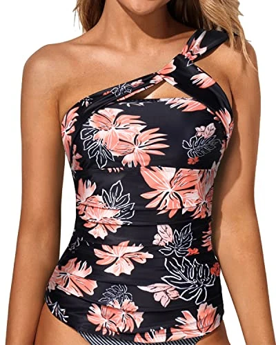 Look stylish and feel confident in this ruched one shoulder tankini top with removable push up padded bra, perfect for any occasion.