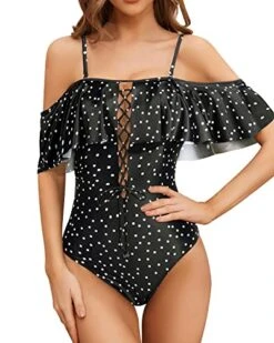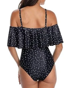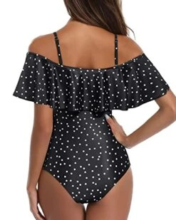 Flattering Off Shoulder One Piece Swimsuit Ruffles-Black White Dot