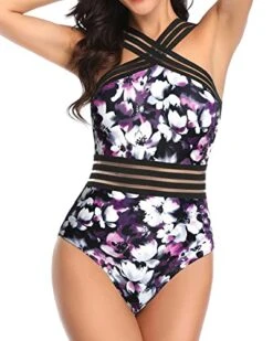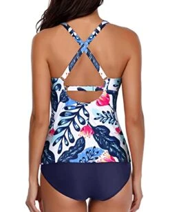 Two Piece Flounce Padded Ruffled Top Women Cross Back Bathing Suit-Black Orange Floral
