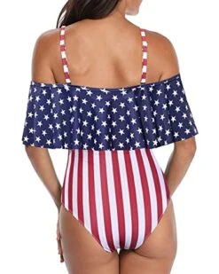 Flattering Off Shoulder One Piece Swimsuit Ruffles-Black White Dot