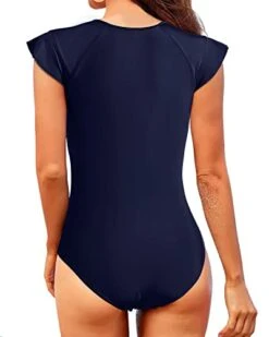 Women’s Zip Front Short Sleeve One Piece Rash Guard-Navy Blue