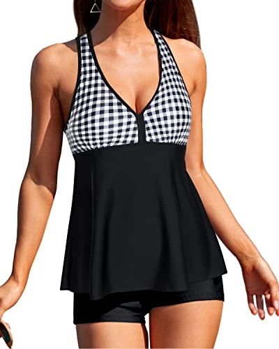 Racerback Tankini Swimsuit Removable Padded Push Up Bras And Boyshort-Black Plaid