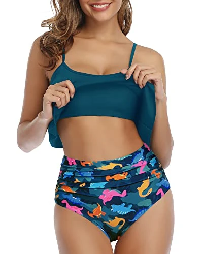 This high waisted bikini set features a double tiered ruffle flounce crop top with removable padded push up bras, paired with a ruched moderate coverage bottom, making it a fashionable and comfortable choice for family parties, summer vacations, honeymoon trips and swimming pool activities.