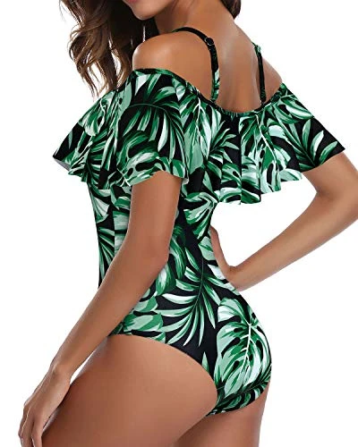 Retro Off Shoulder Ruffled One Piece Swimsuit For Women-Tropical Leaf