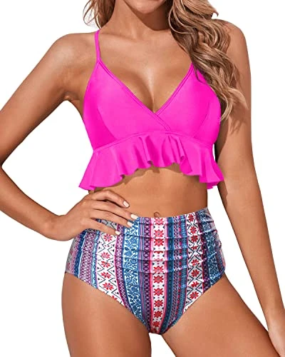 Deep V neck with ruffle flounce hemline of the bikini top is pretty feminine, which accentuates your natural adorable curves, ultra stylish and flattering. Adjustable criss cross straps offer you a better custom fit, removable padded push up bras for extra support and shape.