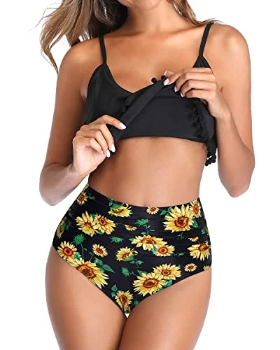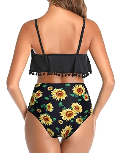 Embrace your inner beach goddess with this charming two piece bathing suit, featuring a flowy ruffled top, adjustable spaghetti straps, removable padded bras and a high waisted bottom for ultimate comfort and tummy control.
