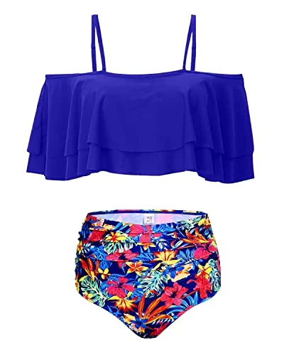 Ruffle Off Shoulder Two Piece Bikini For Women-Royal Blue Floral