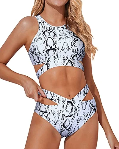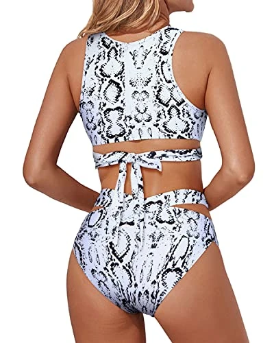 Look and feel amazing in this trendy and comfortable high neck cutout bikini set, featuring a racerback tank top with a zipper and a criss cross bandage bottom that hugs your curves.