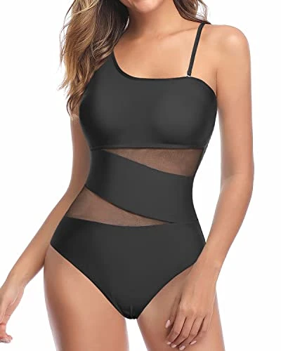 Sexy one-shoulder swimsuit with mesh cutout inserts and tummy control. Removable padded construction, wide shoulder strap, and optional extra support strap. Perfect for flattering, slimming, and standing out on any occasion.