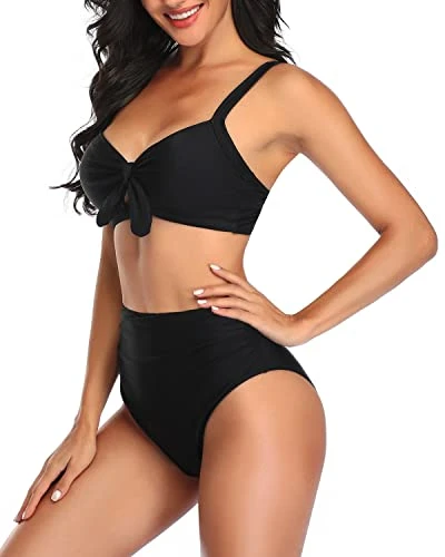 This tummy control high waisted bikini set with tie knot and bowknot detailing is made from durable, stretchy, and comfortable fabric, perfect for water activities and creating a slimming, flattering look.