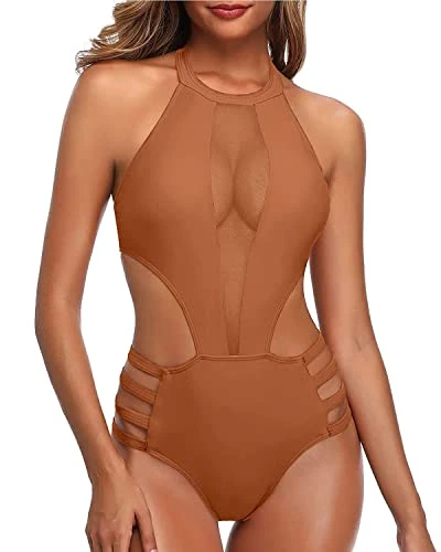 Make a bold statement in this glamorous high neck halter cutout monokini one piece mesh swimsuit, perfect for any beach or poolside occasion.