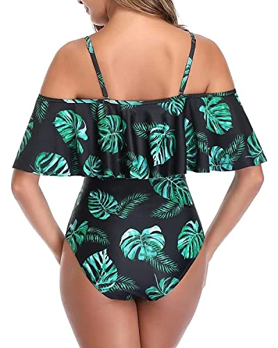 This vintage-inspired off shoulder ruffled swimsuit is a must-have for your next beach getaway, offering a slimming and charming look.