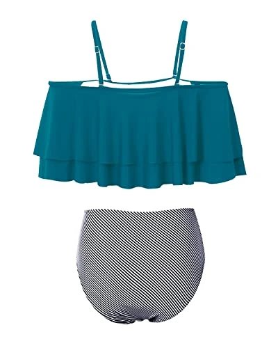 Make a stylish statement at the beach or pool with this adorable bikini set for women, featuring a ruffle off shoulder top and high waisted bottoms with tummy control and adjustable straps for a comfortable and flattering fit.
