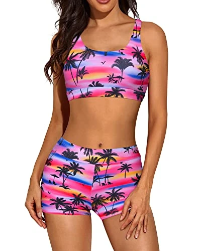 This three-piece swimsuit includes a swim tank top, sports bra, and boy shorts. The athletic tank top features a scoop neck, criss-cross racerback, and keyhole design. You can choose to show your belly or not with this combination.